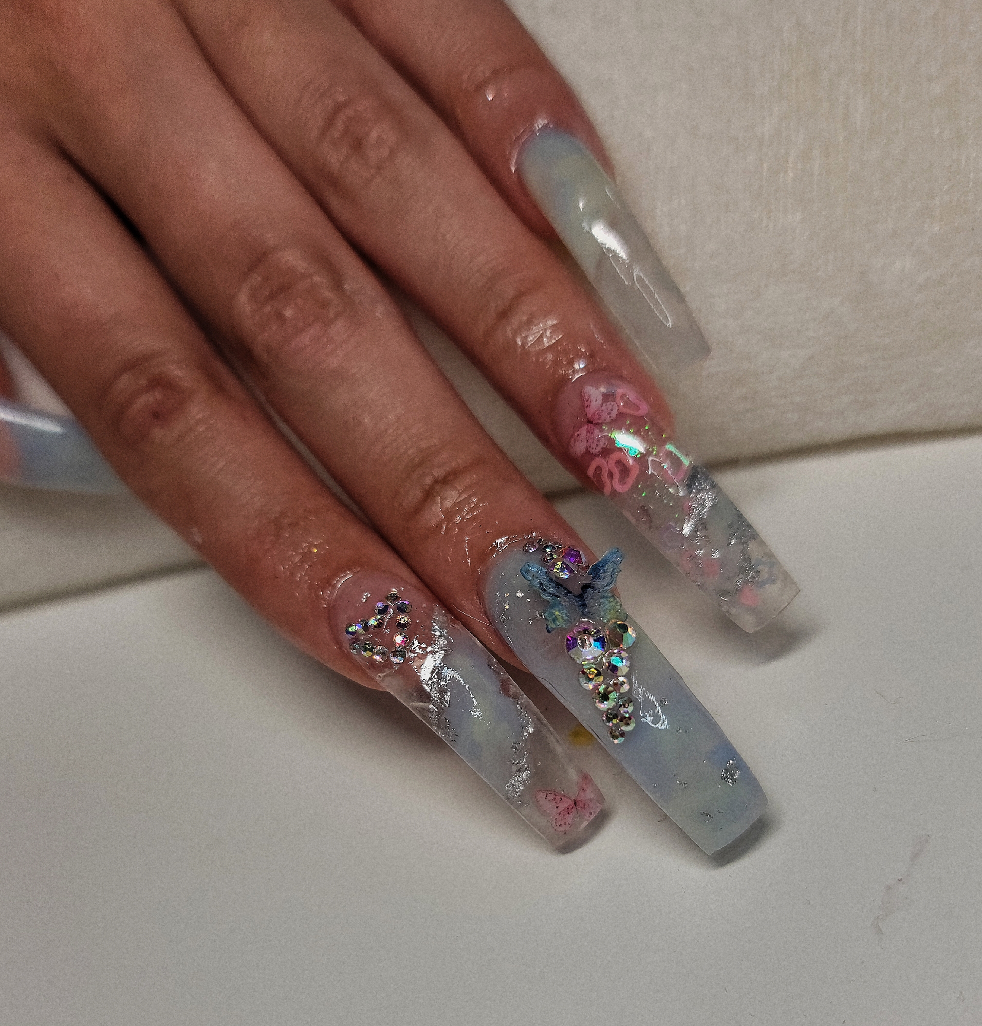 These are totally kawaii nails, encapsulated pink hearts, silver foil, marble, 3d butterfly, crystal heart and a french marble 🦋