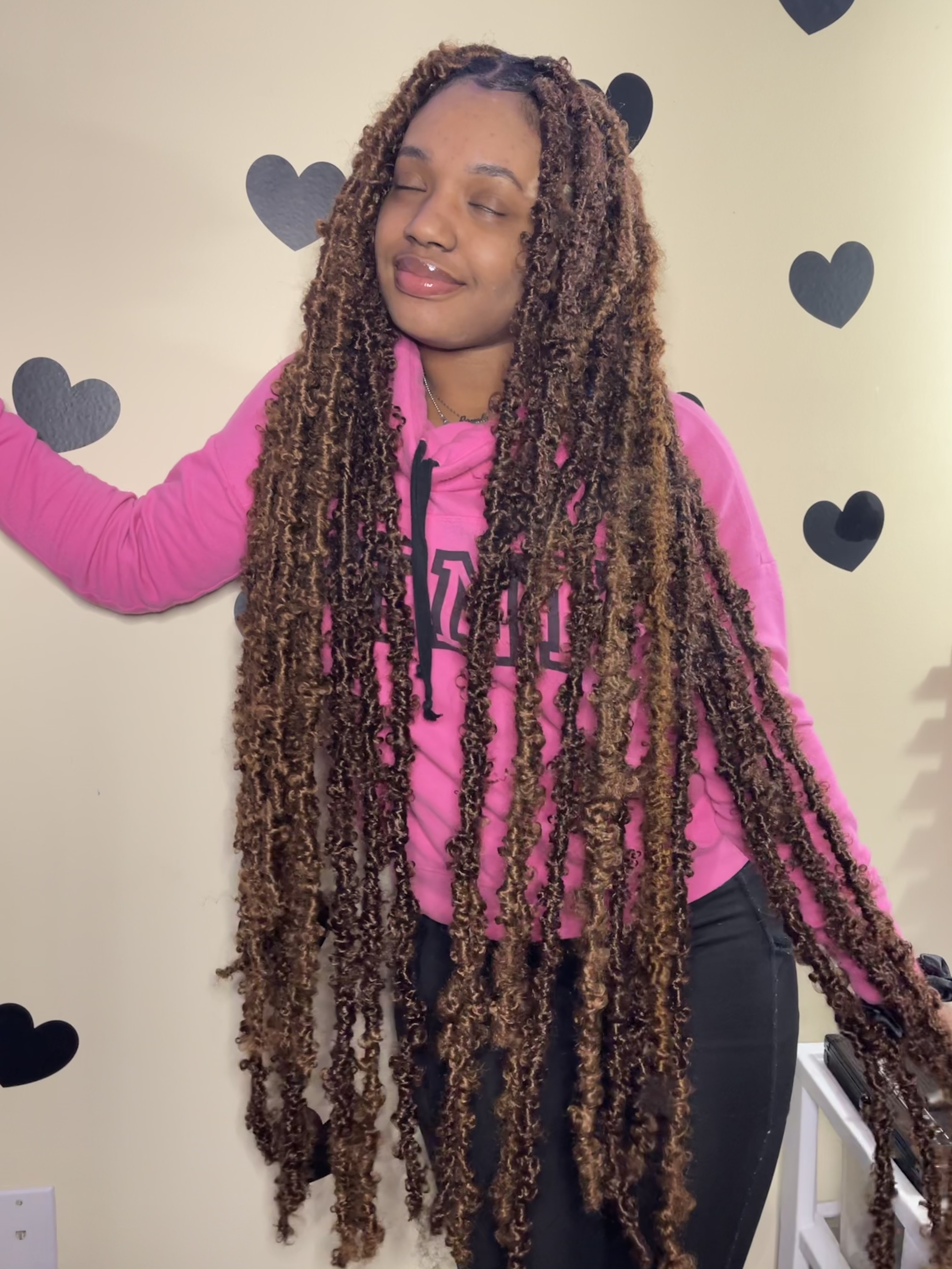 Thigh Length Butterfly Locs are lightweight & tension free! this style can last for up to 3 months with maintenance. Hair is not included in price. Hair can be included for an additional $45. $30 Deposit required