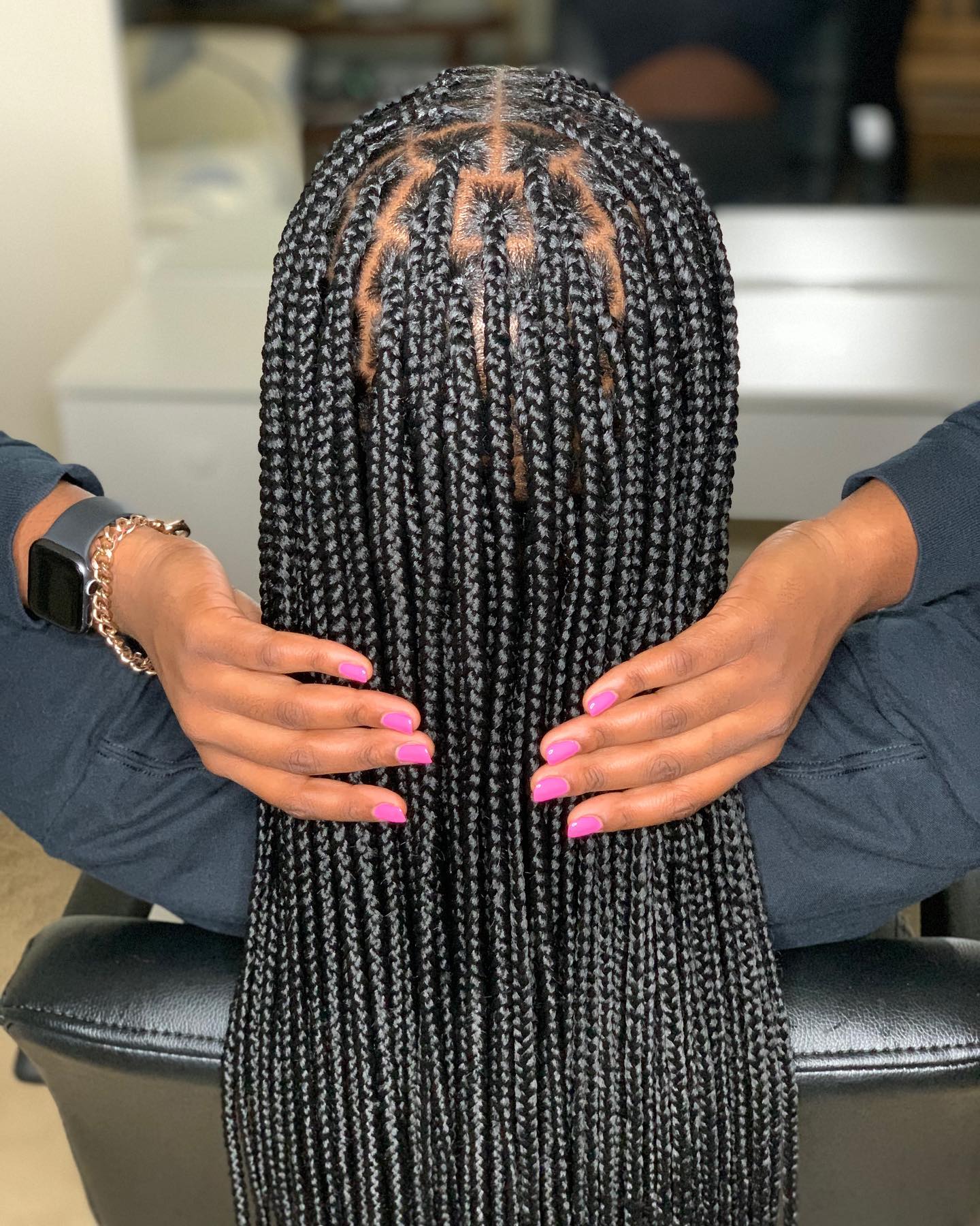This service includes a blow-dry service and installation of waist/hip length Medium knotless box braids.