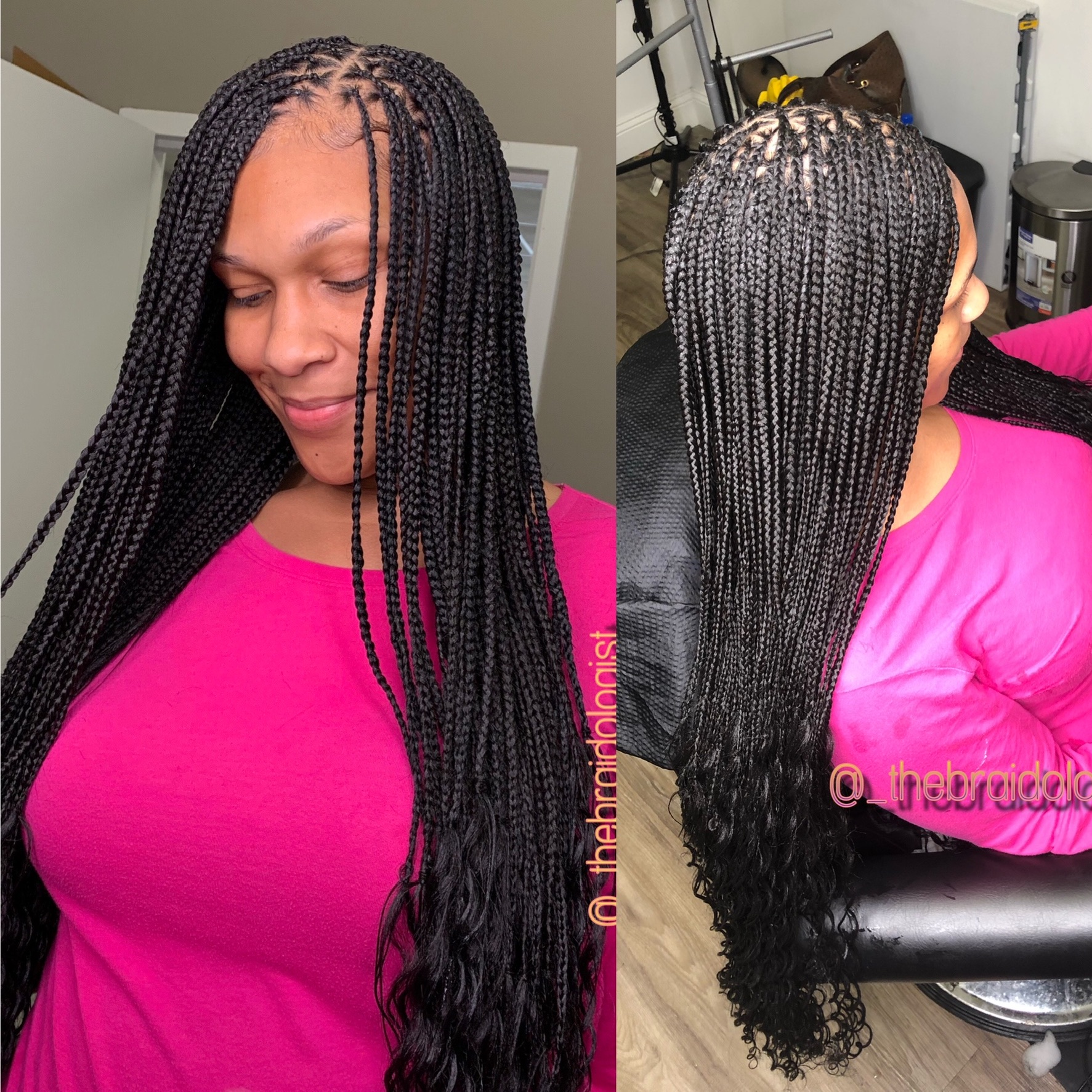 Micro Knotless braids are the perfect combination of tension free braids and style flexibility. You may dress your braids up with curly additions for a cute messy look, pull off a sleek professional bun look or add some refreshing triangle parts!